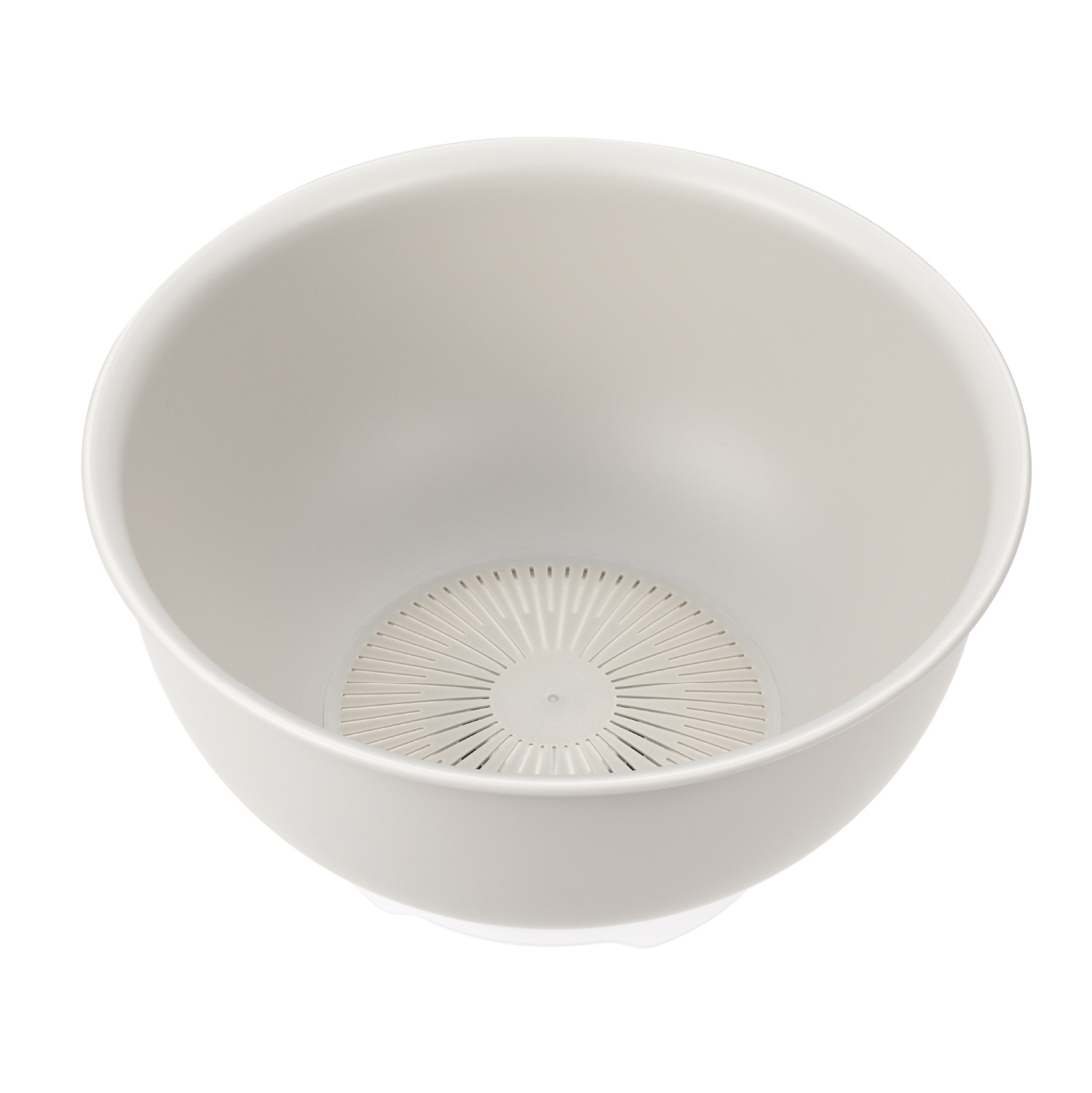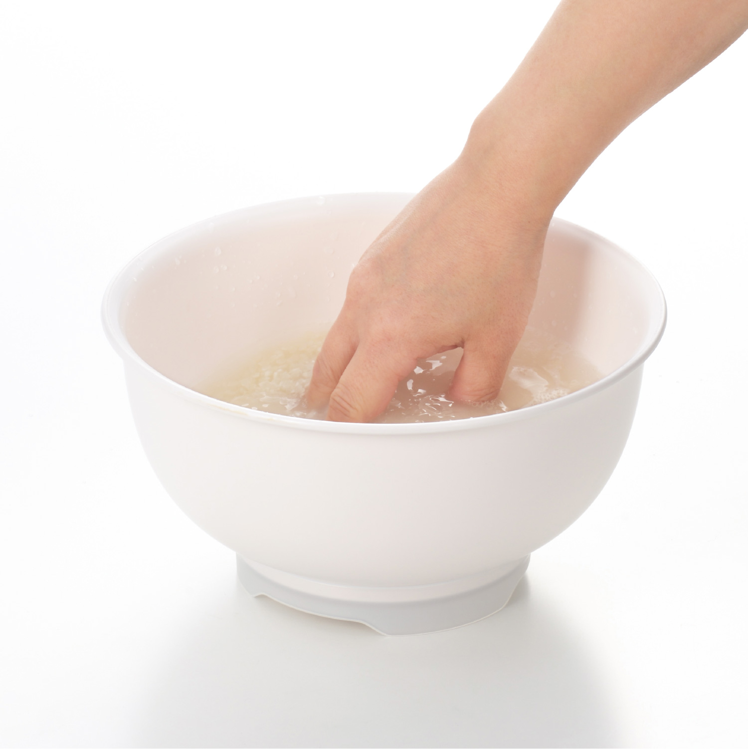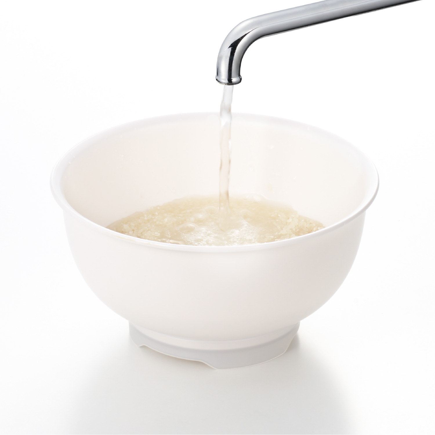 ボウルをシンクに置いてお米を研ぎ、ボウルの中心をグッ!と押すだけで、底からザバッ!と研ぎ汁が抜けます。お米研ぎが、ラク&快適&超スピーディ!